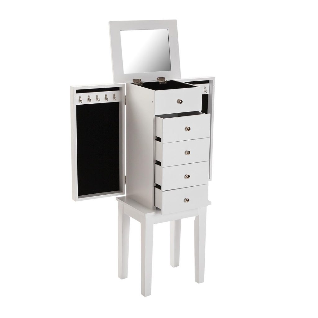 JOYERO DE PIE BLANCO CON SOLAPA CON ESPEJO, 5 CAJONES Y JOYERO LATERALES ABATIBLES.