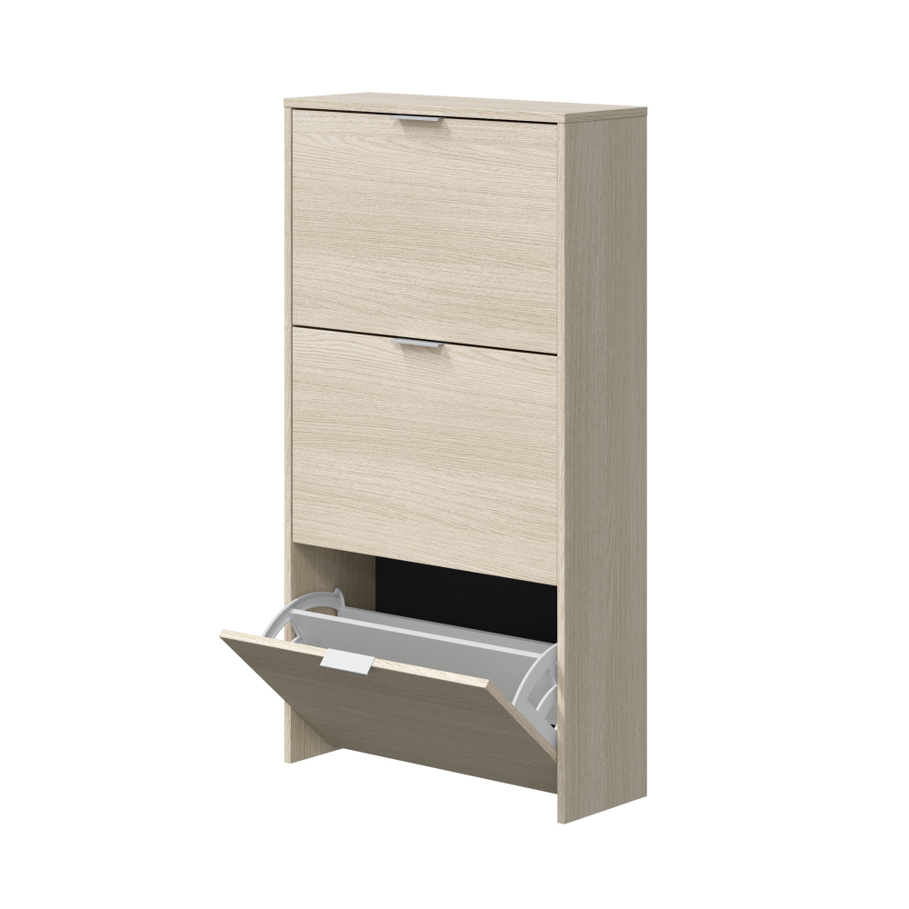 MUEBLE ZAPATERO CON 3 PUERTAS ABATIBLES DE COLOR ROBLE. CAPACIDAD: 18 PARES DE ZAPATOS APROXIMADAMENTE. MATERIAL: MELAMINA. CONTIENE: SISTEMA ABATIBLE ABS DE DOS BANDEJAS PARA LAS PUERTAS ABATIBLES, TACOS ABS QUITARRUIDOS Y ANTIRAYAS Y TIRADORES METÁLICOS. MEDIDAS: 60 x 22 x 113 cm