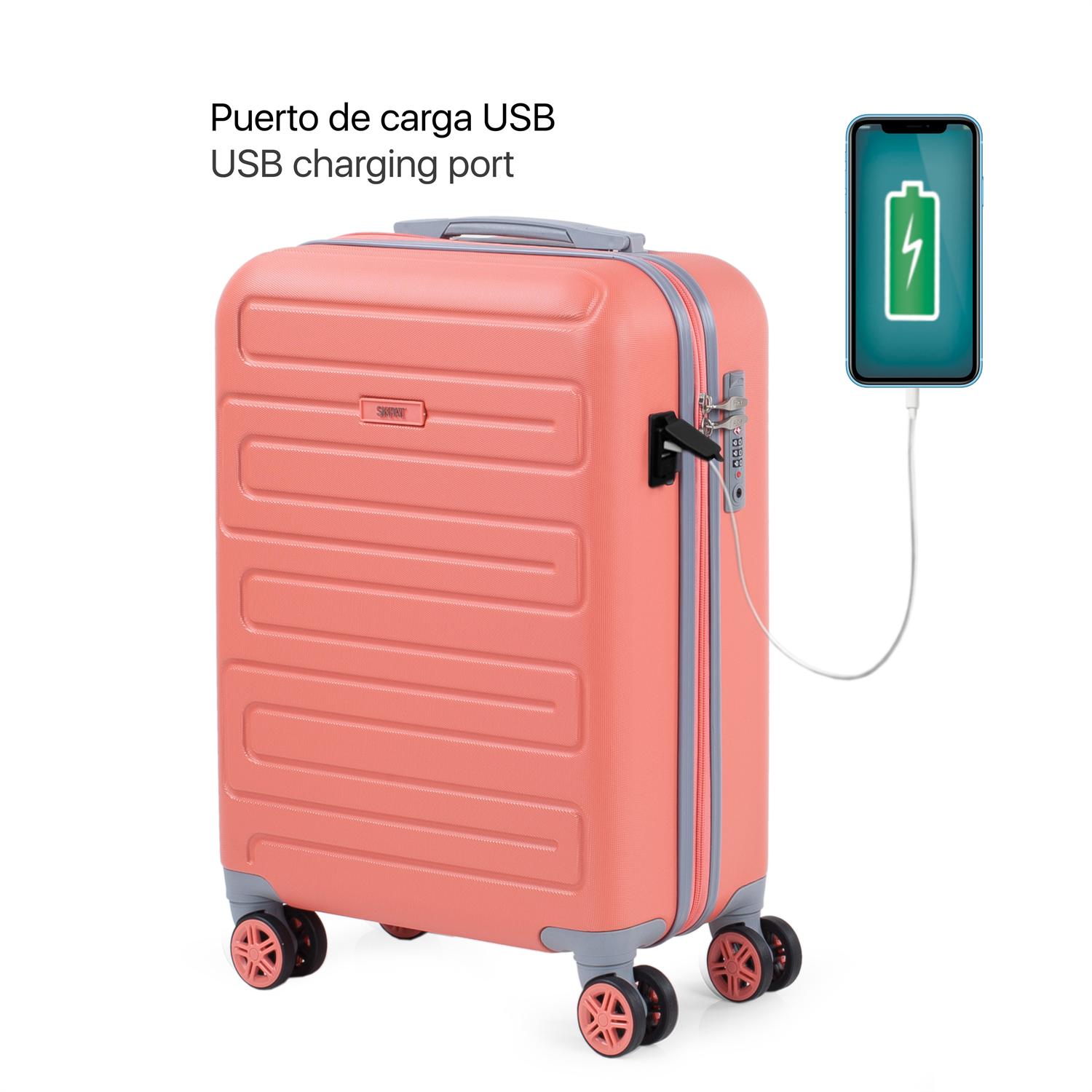 La maleta pequeña dispone de un puerto USB exterior para la carga de dispositivos. Móvil, tablet, ordenador portátil, etc.