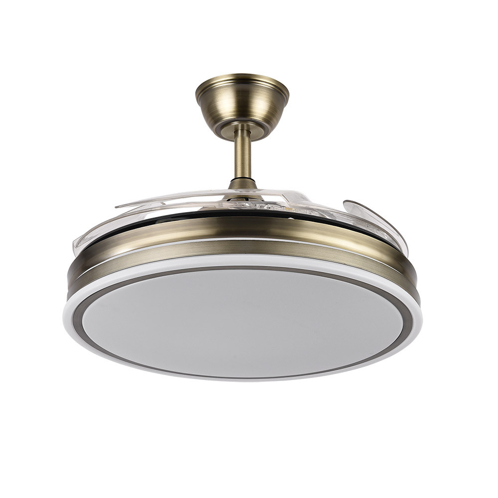 Ventilador BAYOMO realizado en metal y policarbonato, en color CUERO con cuatro aspas DESPLEGABLES de ABS transparente muy resistentes. Motor DC. Tiene seis velocidades ajustables. Tecnología LED integrada con una potencia de 59W, con 3 TEMPERATURAS DE LUZ (3000-4000-6000K) y 6980 lúmenes. Control de aire verano o invierno. Su medida es de 34,5/42X50X50 centímetros con las aspas plegadas y de 34,5/42X107X107 centímetros con las aspas desplegadas, con dos medidas de tija para instalarlo a diferentes alturas. Mando a distancia INCLUIDO, REGULABLE EN INTENSIDAD, con MEMORIA DE COLOR incorporada y TEMPORIZADOR 2/4 H. Modelo disponible en color Níquel, Cuero, Blanco y en color Negro