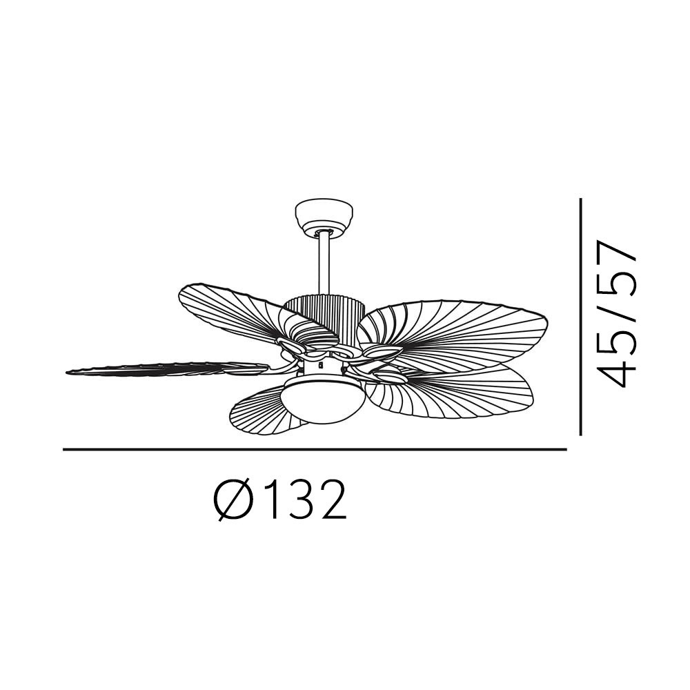 Ventilador DC COLLA realizado en metal, policarbonato y cristal, en color NEGRO con cinco aspas de diseño HOJA DE PALMA TROPICAL de color MARRON. Tiene seis velocidades ajustables. Tecnología LED incorporada con una potencia de 24W, con 3 TEMPERATURAS DE LUZ( 3000-4000-6000K) y 2950 lúmenes. Su medida es de 45/57X132X132 centímetros, viene con DOS MEDIDAS DE TIJA, lo que permite adaptarlo a distintas alturas de techo. Control de aire verano o invierno. Mando a distancia INCLUIDO con MEMORIA DE COLOR incorporada y TEMPORIZADOR 1/2/4/8 H.
