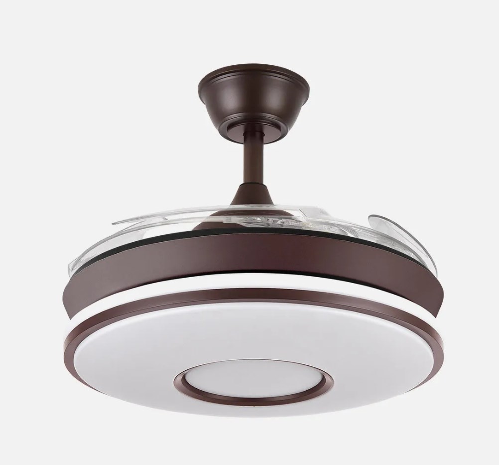 Ventilador DC serie DANI MINI realizado en metal, ABS y policarbonato, en color MARRON con cuatro aspas DESPLEGABLES en ABS muy resistentes. Tiene seis velocidades ajustables. Motor DC. Tecnología LED integrada con una potencia de 59W, con 3 TEMPERATURAS SELECCIONABLES DE LUZ (3000-4000-6000K), luz cálida, natural y blanco frío, y 6980 lúmenes. Control de aire verano o invierno. Su medida es de 34,5/42X40 centímetros con las aspas plegadas y de 34,5/42X91 centímetros con las aspas desplegadas. Incluye dos tijas de 12,5 y 20 centímetros. Es REGULABLE EN INTENSIDAD con mando a distancia INCLUIDO, MEMORIA DE COLOR incorporada y TEMPORIZADOR 2/4 H. Modelo disponible en color blanco, níquel, negro, marrón y cuero, y también en dos tamaños.