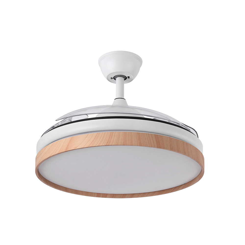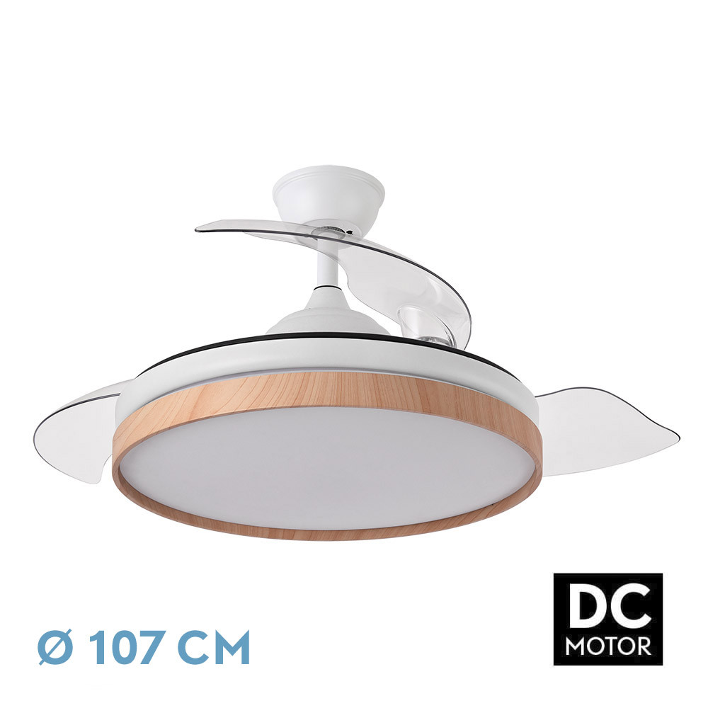 Ventilador DC de la serie EVROS realizado en metal, policarbonato y ABS, en color BLANCO/HAYA con tres aspas DESPLEGABLES de ABS transparente muy resistentes. Tiene seis velocidades ajustables. Tecnología LED integrada con una potencia de 72W, con 3 TEMPERATURAS SELECCIONABLES DE LUZ (3000-4000-6000K) y 6120 lúmenes. Control de aire verano o invierno. Su medida es de 32/47X50 centímetros con las aspas plegadas y de 32/47X107 centímetros con las aspas desplegadas. Incluye dos tijas de 10 y 25 centímetros, para colocar a distintas alturas. Mando a distancia INCLUIDO con MEMORIA DE COLOR incorporada y TEMPORIZADOR 1/2/4 H.