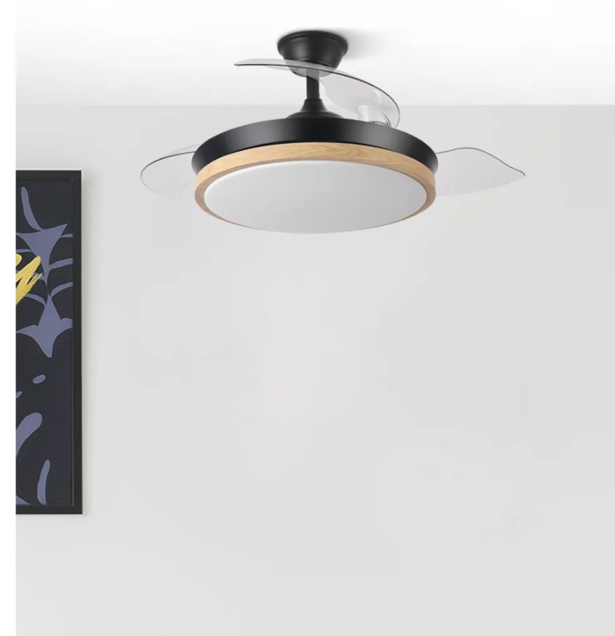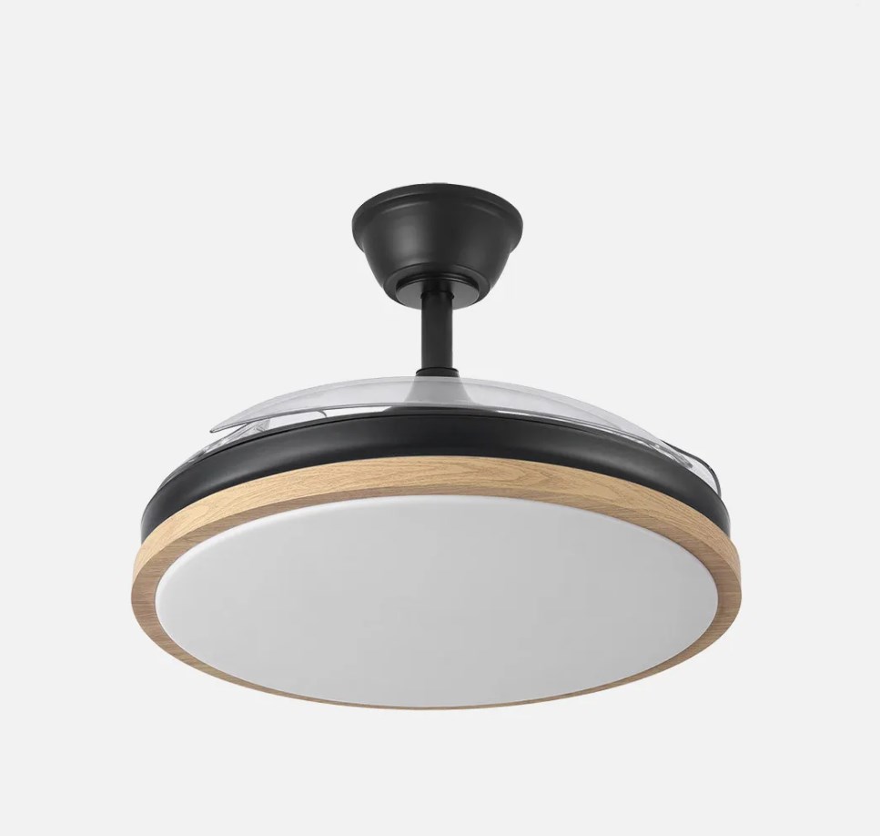 Ventilador DC de la serie EVROS realizado en metal, policarbonato y ABS, en color NEGRO/HAYA con tres aspas DESPLEGABLES de ABS transparente muy resistentes. Tiene seis velocidades ajustables. Tecnología LED integrada con una potencia de 59W, con 3 TEMPERATURAS SELECCIONABLES DE LUZ (3000-4000-6000K) y 6980 lúmenes. Control de aire verano o invierno. Su medida es de 32/47X50 centímetros con las aspas plegadas y de 32/47X107 centímetros con las aspas desplegadas. Incluye dos tijas de 10 y 25 centímetros, para colocar a distintas alturas. Mando a distancia INCLUIDO, , REGULABLE EN INTENSIDAD, con MEMORIA DE COLOR incorporada y TEMPORIZADOR 2/4 H. Modelo disponible en blanco/haya y en negro/haya y en dos tamaños.