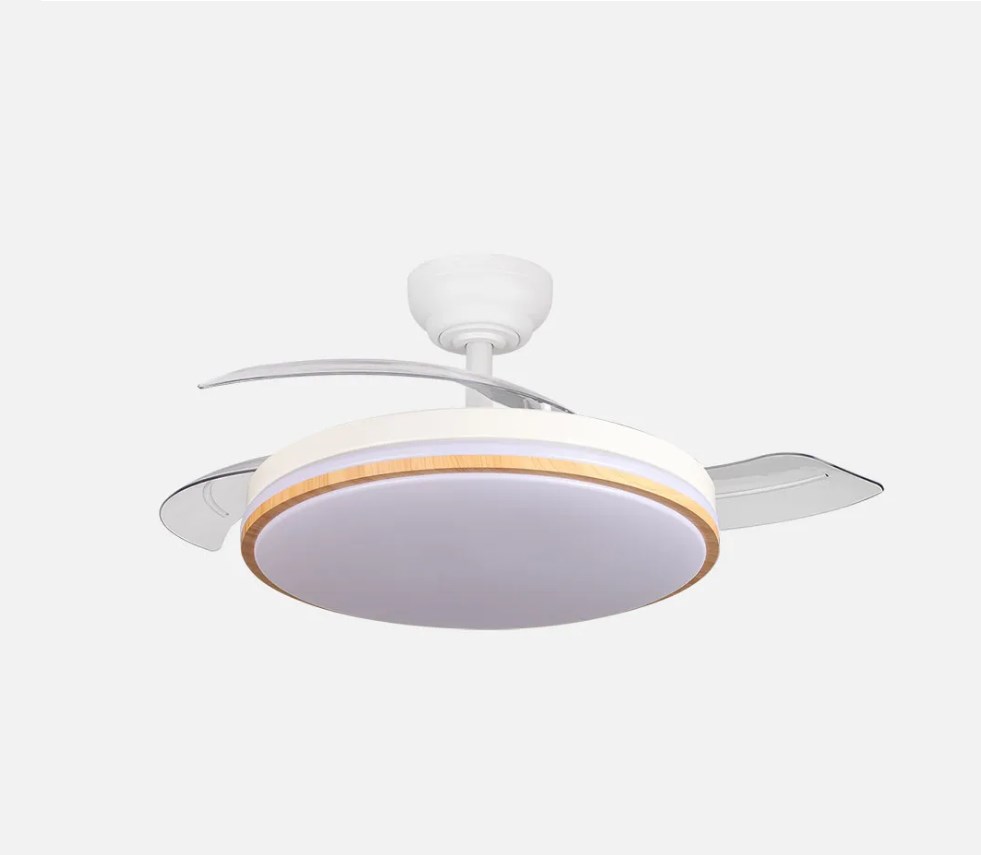 Ventilador DC de la serie RELAMPAGO realizado en metal, policarbonato y ABS, en color BLANCO/HAYA con tres aspas DESPLEGABLES de ABS transparente muy resistentes. Diseño muy moderno y original. Tiene seis velocidades ajustables. Tecnología LED integrada con una potencia de 60W, con 3 TEMPERATURAS SELECCIONABLES DE LUZ (3000-4300-6500K) y 6980 lúmenes. Control de aire verano o invierno. Su medida es de 36X48X48 centímetros con las aspas plegadas y de 36X107X107 centímetros con las aspas desplegadas. Mando a distancia INCLUIDO, REGULABLE EN INTENSIDAD, con MEMORIA DE COLOR incorporada y TEMPORIZADOR 2H y 4H. Modelo disponible en color blanco y en color blanco/haya para elegir el que mejor le venga con su decoración.