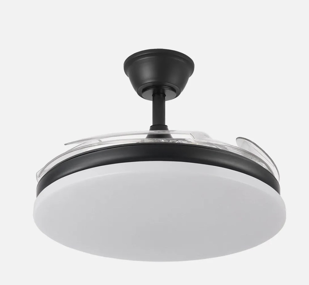 Ventilador DC de la serie TRIDENTE realizado en metal, policarbonato y ABS, en color NEGRO con cuatro aspas DESPLEGABLES de ABS transparente muy resistentes. De diseño innovador, ideal para completar tanto en decoraciones modernas como clásicas, realizando tanto la función de lámpara como de ventilador. Motor DC con seis velocidades ajustables. Tecnología LED integrada con una potencia de 59W, 6980 lúmenes y 3 TEMPERATURAS SELECCIONABLES DE LUZ (3000-4000-6000K) luz cálida, natural y blanco frío. Es REGULABLE EN INTENSIDAD, con mando a distancia INCLUIDO con MEMORIA DE COLOR incorporada y TEMPORIZADOR 2/4 H. Control de aire verano o invierno. Su medida es de 34,5/42X50 centímetros con las aspas plegadas y de 34,5/42X107 centímetros con las aspas desplegadas. Incluye dos tijas de 12,5 y 20 centímetros, para colocar a distintas alturas. Encontramos en esta serie dos tamaños de ventiladores y en los colores blanco, negro, níquel y cuero, para elegir el más le guste y el que mejor se adapte a su decoración.