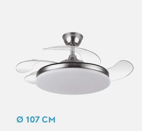 VENTILADOR DC TRIDENTE 59W NIQUEL 4ASPAS DESP.107D 6980LM REG.INTENSIDAD REMOTO+TEMPORIZADOR+MEMORIA 3000-4000-6000K