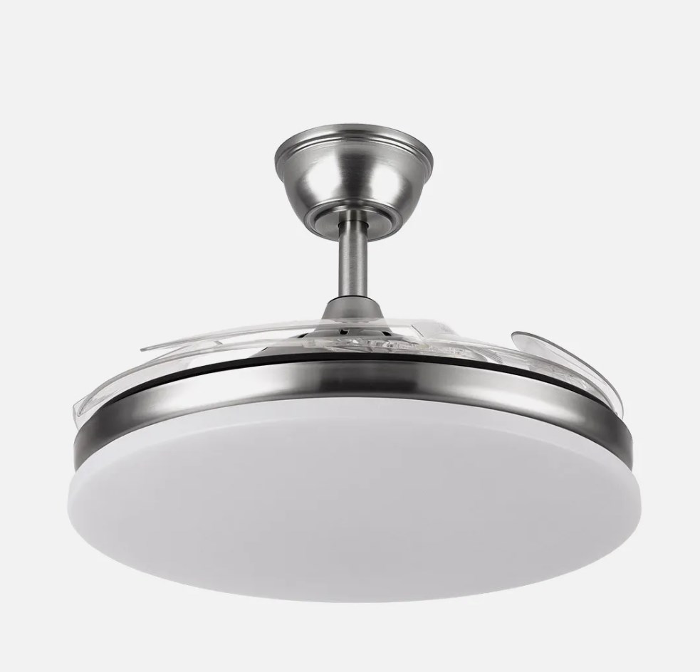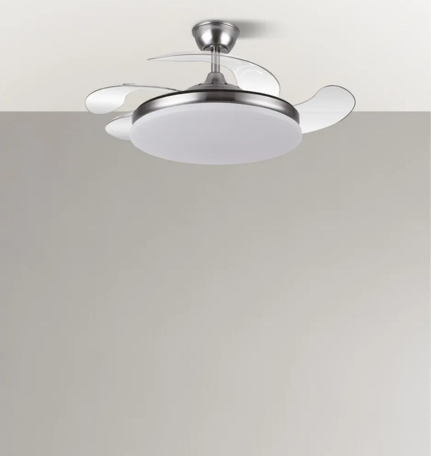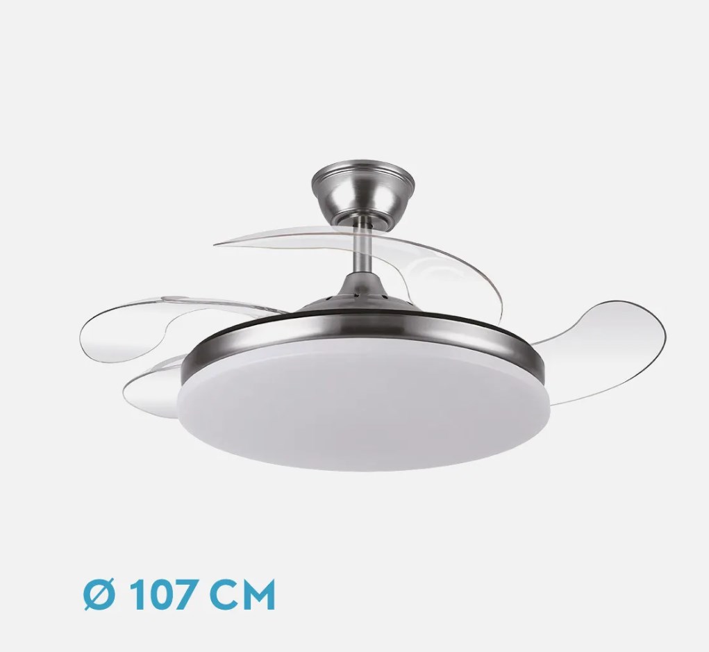 Ventilador DC de la serie TRIDENTE realizado en metal, policarbonato y ABS, en color NIQUEL con cuatro aspas DESPLEGABLES de ABS transparente muy resistentes. De diseño innovador, ideal para completar tanto en decoraciones modernas como clásicas, realizando tanto la función de lámpara como de ventilador. Motor DC con seis velocidades ajustables. Tecnología LED integrada con una potencia de 59W, 6980 lúmenes y 3 TEMPERATURAS SELECCIONABLES DE LUZ (3000-4000-6000K) luz cálida, natural y blanco frío. Es REGULABLE EN INTENSIDAD, con mando a distancia INCLUIDO con MEMORIA DE COLOR incorporada y TEMPORIZADOR 2/4 H. Control de aire verano o invierno. Su medida es de 34,5/42X50 centímetros con las aspas plegadas y de 34,5/42X107 centímetros con las aspas desplegadas. Incluye dos tijas de 12,5 y 20 centímetros, para colocar a distintas alturas. Encontramos en esta serie dos tamaños de ventiladores y en los colores blanco, negro, níquel y cuero, para elegir el más le guste y el que mejor se adapte a su decoración.