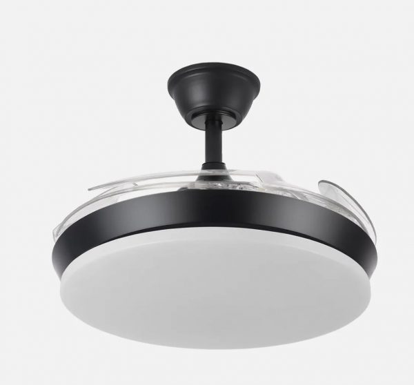 Ventilador DC de la serie TRIDENTE MINI realizado en metal, policarbonato y ABS, en color NEGRO con cuatro aspas DESPLEGABLES de ABS transparente muy resistentes. De diseño innovador, ideal para completar tanto en decoraciones modernas como clásicas, realizando tanto la función de lámpara como de ventilador. Motor DC con seis velocidades ajustables. Tecnología LED integrada con una potencia de 59W, 6980 lúmenes y 3 TEMPERATURAS SELECCIONABLES DE LUZ (3000-4000-6000K) luz cálida, natural y blanco frío. Es REGULABLE EN INTENSIDAD, con mando a distancia INCLUIDO con MEMORIA DE COLOR incorporada y TEMPORIZADOR 2/4 H. Control de aire verano o invierno. Su medida es de 34,5/42X40 centímetros con las aspas plegadas y de 34,5/42X91 centímetros con las aspas desplegadas. Incluye dos tijas de 12,5 y 20 centímetros, para colocar a distintas alturas. Encontramos en esta serie dos tamaños de ventiladores y en los colores blanco, negro, níquel y cuero, para elegir el más le guste y el que mejor se adapte a su decoración.